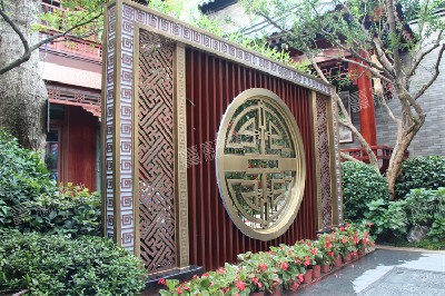 材质:铜牌匾、铜背景墙、铜屏风、铜廊架格栅